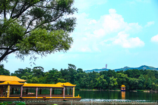 湖泊区是山庄的精华所在,仿佛江南水乡的微缩模型。湖面被洲岛堤桥分割成多个区域,形成了层次丰富的景观。著名的“芝径云堤”仿杭州西湖苏堤而建,漫步堤上,湖光山色尽收眼底。湖区散布着众多精巧的亭台楼阁,如仿嘉兴南湖烟雨楼的“烟雨楼”,仿镇江金山寺的“金山上帝阁”,每一处都蕴含着诗情画意。夏季乘船游湖,荷花盛开,清风拂面,最能体会“避暑”二字的真谛。