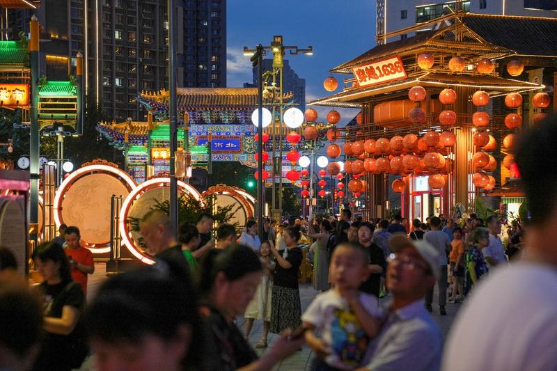 首推老北市核心区——皇寺广场周边。这里是老北市的灵魂所在,重建后的街区复原了上世纪二三十年代的风貌。青砖灰瓦的仿古建筑、悬挂的招牌幌子,瞬间将人拉回旧时光。白天,你可以参观锡伯族家庙等历史遗迹,感受多民族文化的交融。到了夜晚,灯火璀璨,广场上的主题雕塑和灯光秀更是拍照打卡的绝佳背景。这里时常举办各类民俗市集,热闹非凡。
