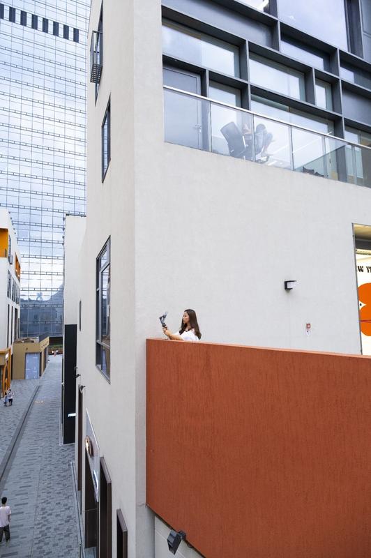 小镇露天广场是深业上城的标志性区域。这里色彩明快的建筑外墙与蓝天构成绝佳背景,是摄影爱好者的热门取景地。漫步在连接商场的空中廊桥,可以俯瞰繁华街景,感受现代都市的脉搏。