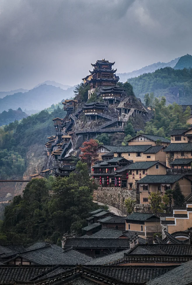 来到望仙谷,最震撼的莫过于其标志性的悬空民宿建筑群。百间客房如同镶嵌在垂直崖壁之上,以夯土墙、木结构、茅草顶还原了古朴的村落样貌,夜幕降临时灯光亮起,宛如现实版的仙侠世界,这正是“望仙”之名的生动写照。游客漫步在峡谷栈道上,脚下是潺潺的溪流,抬头是云雾缭绕的峭壁楼阁,沉浸感极强。
