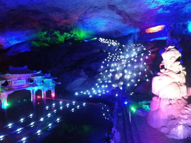 进入洞内,首先迎接游客的是“狮象迎宾”景观,宛如一头威武雄狮与一只稳重巨象在守护仙境大门。随着脚步深入,各种石笋、石柱、石幔、石瀑在彩色灯光的映衬下,呈现出千姿百态的形象。有的如“银河飞瀑”,气势磅礴;有的如“瀛洲华表”,亭亭玉立;更有“三十三重天”等层层叠叠的瑶池玉田,令人叹为观止。洞内常年恒温在18摄氏度左右,冬暖夏凉,气候宜人。
